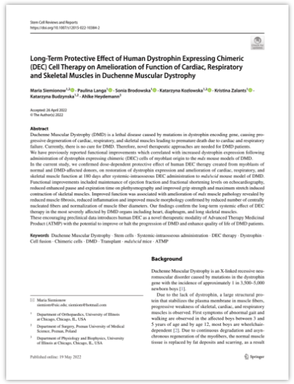 Human dystrophin expressing chimeric (DEC) cell therapy ameliorates cardiac, respiratory, and skeletal muscle's function in Duchenne muscular dystrophy